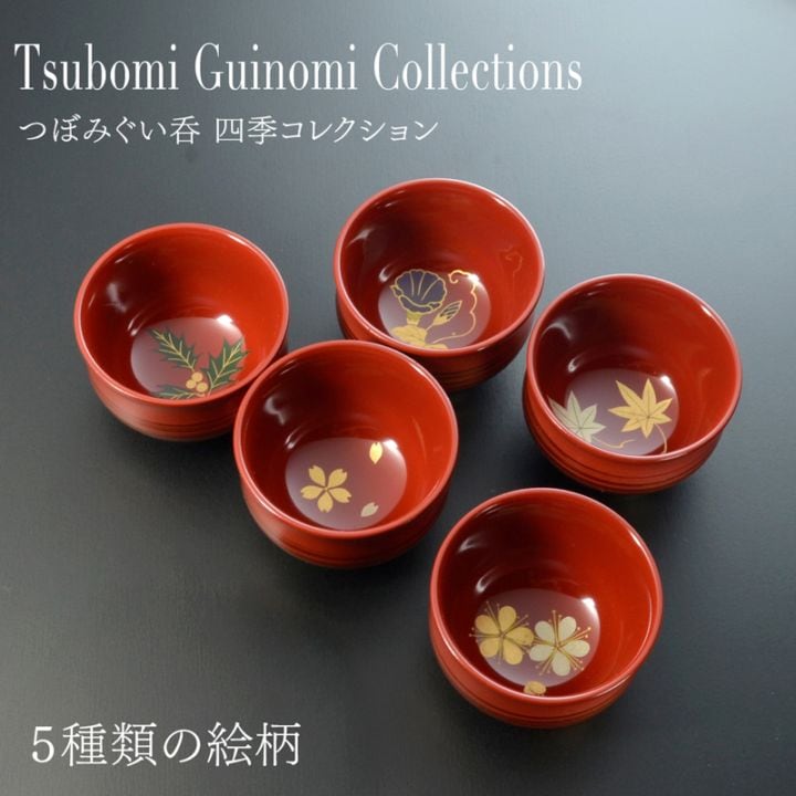 日本の四季をイメージする【桜・朝顔・もみじ・梅】の絵柄をそれぞれに蒔絵をしたかわいいぐい呑をです。